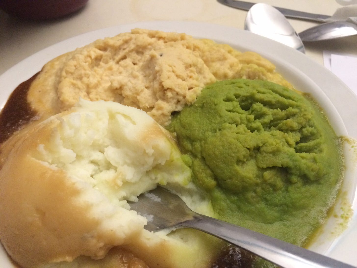 One dinnertime, that slip of paper told me that under the cloche covering my food, I would find chicken à la king. That sounded fancy, and I wondered what the hospitals’ interpretation of this would be. I lifted the cloche and almost laughed. There was an ice cream scoop of mashed potatoes, a fluorescent green blob, and a hideous splotch of something that reminded me of a dead mollusc. The kitchen staff had covered the mashed potatoes in watery gravy that spread over the whole plate, and the already unappetizing chow was swimming in a murky brown puddle.